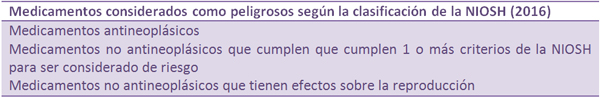 - consultar si el medicamento aparece en la lista NIOSH (Nacional Institute for Occupational Safety and Health (NIOSH). Esta lista hace referencia la clasificación de medicamentos que son peligrosos.