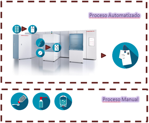 - envasado en frasco. Al igual que en el punto anterior, se requiere de la participación activa del técnico de farmacia para preparar la medicación.