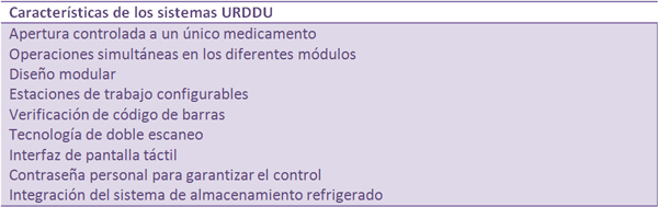 Las URDDU son sistemas modulares en los que se almacena la medicación en dosis unitaria (con el mismo tipo de envasado y etiquetaje) de las especialidades que lo requieren y, a posteriori, su distribución de medicamentos en dosis unitaria mediante bolsitas o anillas que recoge la medicación que ha de tomar el paciente por el período de 24 horas.