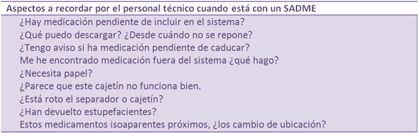 En el período de la puesta en marcha del SADME, es importante trabajar en equipo con el personal de enfermería y durante el período de formación contar con los especialistas de los sistemas automatizados.
