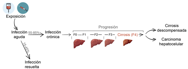 La HCC es una causa bien establecida de enfermedad hepática, incluyendo CH y CHC. El daño hepático se produce por la inflamación crónica de las células del hígado (hepatocitos). El depósito de fibras de colágeno provoca la transformación del tejido sano en un tejido más fibroso parecido a una cicatriz, lo que se denomina fibrosis hepática y cuyo estadio final es la CH. El riesgo de desarrollar una CH es muy variable y puede oscilar entre un 5% y 25% en un período de 25 a 30 años8,9. Sin embargo, hay algunos factores que pueden acelerar la progresión de la fibrosis y el desarrollo de la CH como, por ejemplo, el consumo de alcohol, la presencia de otras hepatitis virales o la coinfección por el VIH10. Una vez que se ha instaurado la cirrosis el riesgo de descompensación y de aparición de un CHC va aumentando por cada año transcurrido, siendo de un 2% anual para la descompensación de la cirrosis, y entre el 0,7% y el 23% anual para el CHC8.