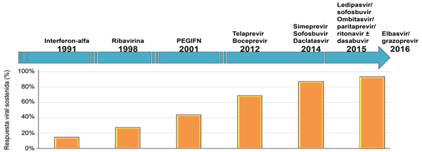 El año 2014 fue trascendental para los pacientes infectados por el VHC. Se autorizaron tres nuevos AAD (sofosbuvir, simeprevir y daclatasvir) para su utilización, tanto combinados con PEGIFN, como asociados con otros AAD en regímenes de administración oral. En 2015 aparecieron los primeros antivirales co-formulados, combinando diferentes AAD en un mismo comprimido. Las combinaciones de AAD sin PEGIFN lograron aumentar las tasas de RVS a valores antes inimaginables, llegando a superar el 90%.