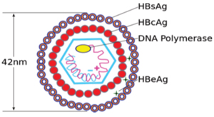 La partícula viral completa, también conocida como partícula Dane, tiene un tamaño aproximado de 42nm. Presenta una cubierta o envoltura lipídica donde se localiza el antígeno de superficie (HBsAg). En su interior se encuentra la nucleocápside conocida como “core” que contiene el DNA viral, y la enzima polimerasa viral, importante en la replicación del virus. Este complejo es rodeado por los antígenos del core (HBcAg) y el antígeno e (HBeAg) (Figura 3).