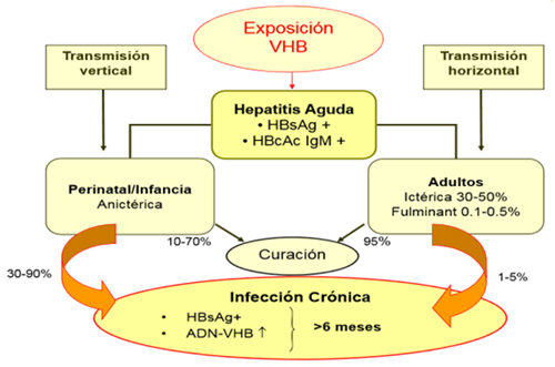 Tras un primer contacto con el VHB se produce una hepatitis aguda caracterizada por la positivización del HBsAg y la aparición de anticuerpos frente al core (HBcAc) predominantemente de tipo IgM. El HBeAg también puede ser detectado en la mayoría de los pacientes con infección aguda. Los niveles circulantes de DNA del VHB (DNA-VHB) son muy altos y los niveles de alaninoaminotransferasa (ALT) comienzan a aumentar cuando se establece la replicación viral, como resultado de la respuesta inmune contra los hepatocitos infectados.