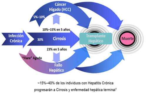 La hepatitis crónica por VHB es una enfermedad hepática que, en aproximadamente el 30% de los pacientes, evolucionará a cirrosis hepática y enfermedad hepática terminal (Figura 6).