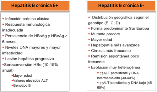 Se diferencian dos tipos de hepatitis B crónica: la antígeno E positivo (HBeAg+) y la antígeno E negativo (HBeAg-), siendo esta última una variante mutada del virus que no expresa el antígeno E. Las características de cada una de ellas se recogen en la tabla 1:
